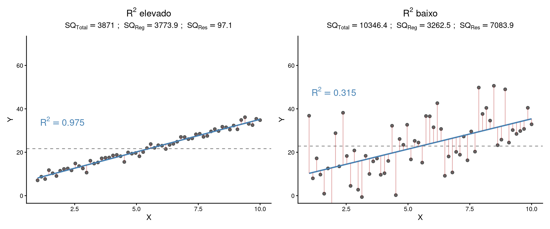 Em ambos os cenários, a reta de regressão apresenta a mesma inclinação populacional (\(\beta_1 = 3\)), o que produz valores de \(SQ_{Reg}\) bastante semelhantes. A diferença fundamental reside na variância residual. Na figura à esquerda, os pontos estão fortemente concentrados em torno da reta, o que implica um \(SQ_{Res}\) relativamente pequeno em comparação com a variação total (\(SQ_{Total}\)) e, consequentemente, um \(R^2\) elevado (\(SQ_{Res} = 97.08\), \(R^2 = 0.975\)). Em contraste, na figura à direita, observa-se maior dispersão dos pontos em torno da reta ajustada, resultando em um \(SQ_{Res}\) mais elevado e, portanto, em um \(R^2\) mais baixo (\(SQ_{Res} = 7083.93\), \(R^2 = 0.315\)).