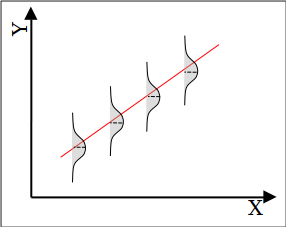 No modelo de regressão linear que veremos aqui, os resídos são uma variável aleatória prevenientes de uma distribuição normal de probabilidades com média \(\mu = 0\) e variância \(\sigma^2\) constante ao longo da reta de regressão, \(N(0, \sigma^2)\).
