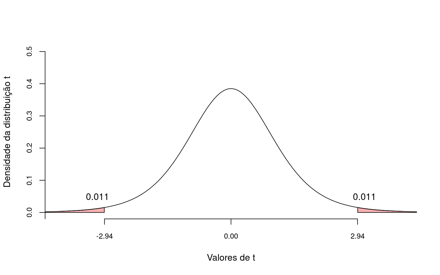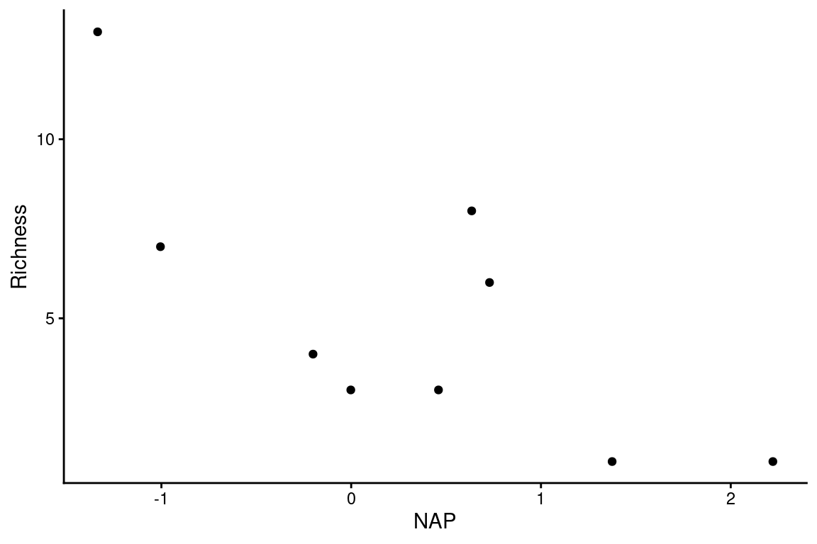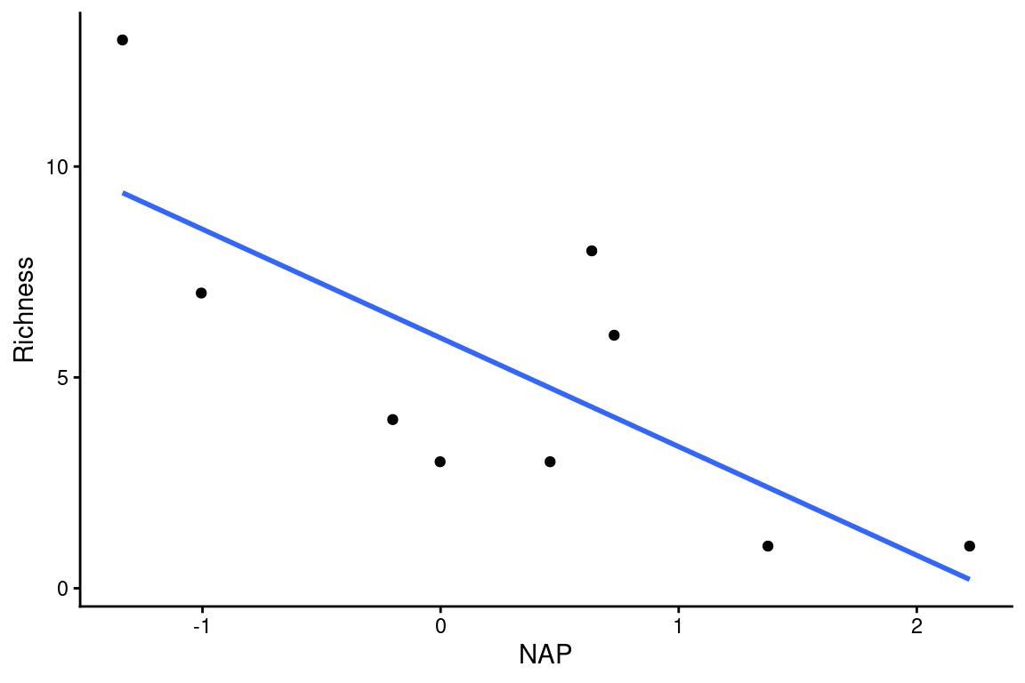 Se nosso nível de significancia \(\alpha = 0.05\), então a probabilidade \(p = 0.011 + 0.011 = 0.022\) indica que devemos rejeitar \(H_0\) e aceitar que existe uma relação entre Riqueza de espécies e NAP.