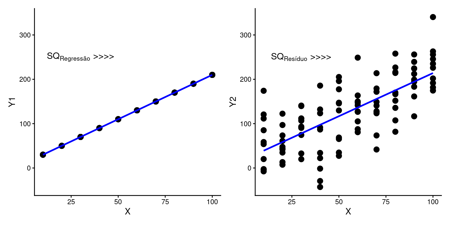 \[R^2 = \frac{SQ_{Regressão}}{SQ_Y} = 1 - \frac{SQ_{Resíduo}}{SQ_Y}\]