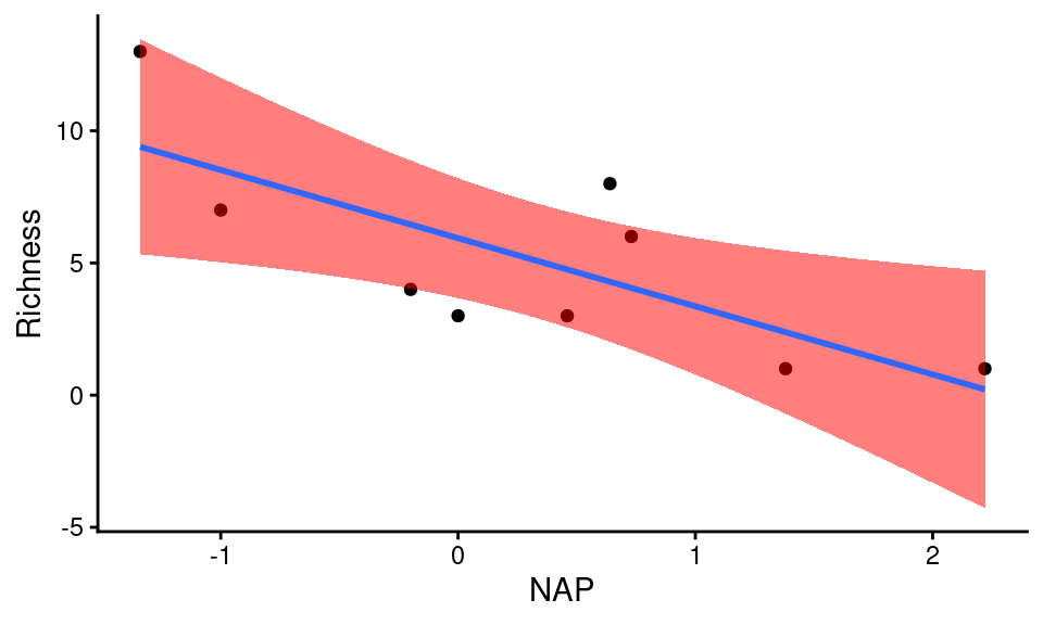 Note que na figura acima, estão representados os valores observados de riqueza de espécies (em preto), os valores ajustados (azul) e os intervalos a 95% (vermelho). Os valores ajustados são aqueles utilizados para construir a reta de regressão. O intervalo não costuma ser representados por pontos individuais, mas por uma banda que delimita a área que restringe o intervalo de confiança ao nível \(1 - \alpha\) como na figura abaixo.