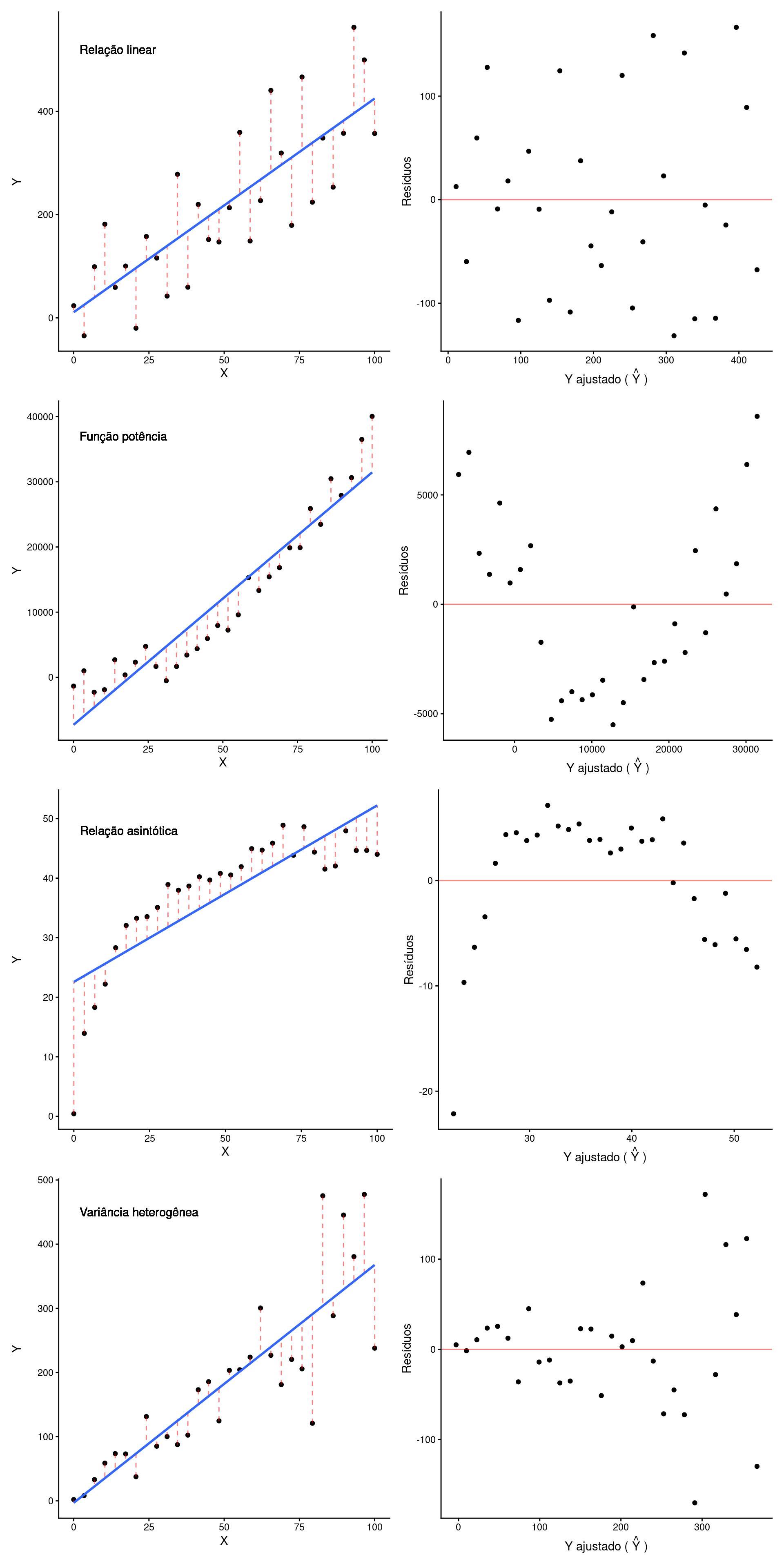 O primeiro diagnóstico da regressão é conhecido como gráfico de resíduos, que consiste em um gráfico de dispersão entre os resíduos e o valor ajustado \(\hat{Y}\). Abaixo estão os gráficos de resíduos que surge quando ajustamos uma reta a dados que apresentam uma relação linear, uma função potência, uma função assintótica e uma relação linear porém comm variância heterogênea.
