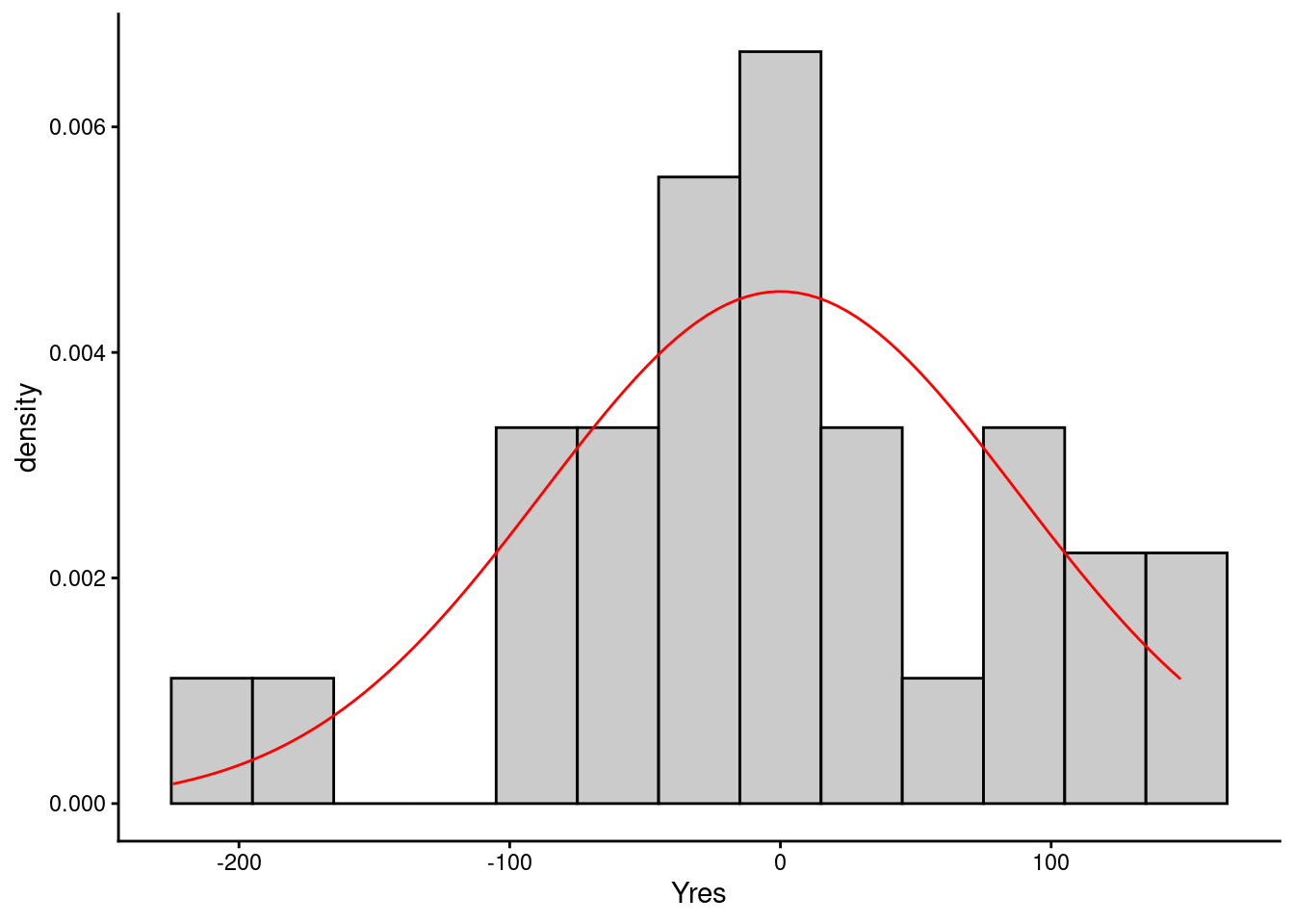 Outro diagnóstico da regressão consiste em fazer um histograma dos gráficos de resíduos. Um histograma, aproximadamente simétrico ao redor de zero o que sugere que o pressuposto de normalidade dos resíduos é válido neste caso. Existem testes formais de normalidade cmo o teste de Kolmogorov Smirnov ou o teste de Shapiro-Wilk.