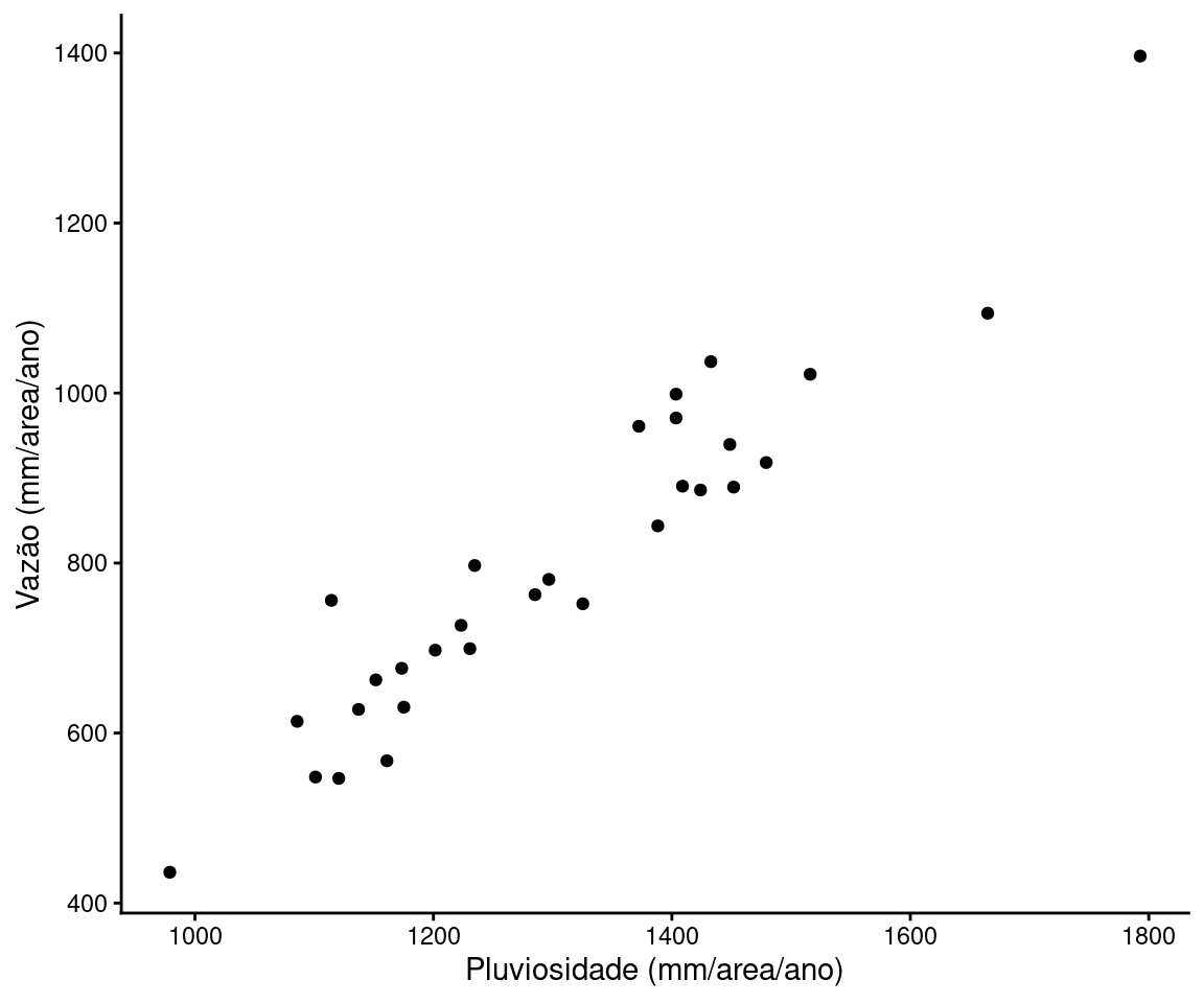 (\(df) df[-31, ])()Considere novamente os dados sobre pluviosidade anual e vazão em uma bacia hidrográfica americada, medidos entre os anos de 1958 e 1987 (disponível em: tiee.esa.org). Vamos avaliar a relação entre a vazão na bacia e os volumes de chuva.