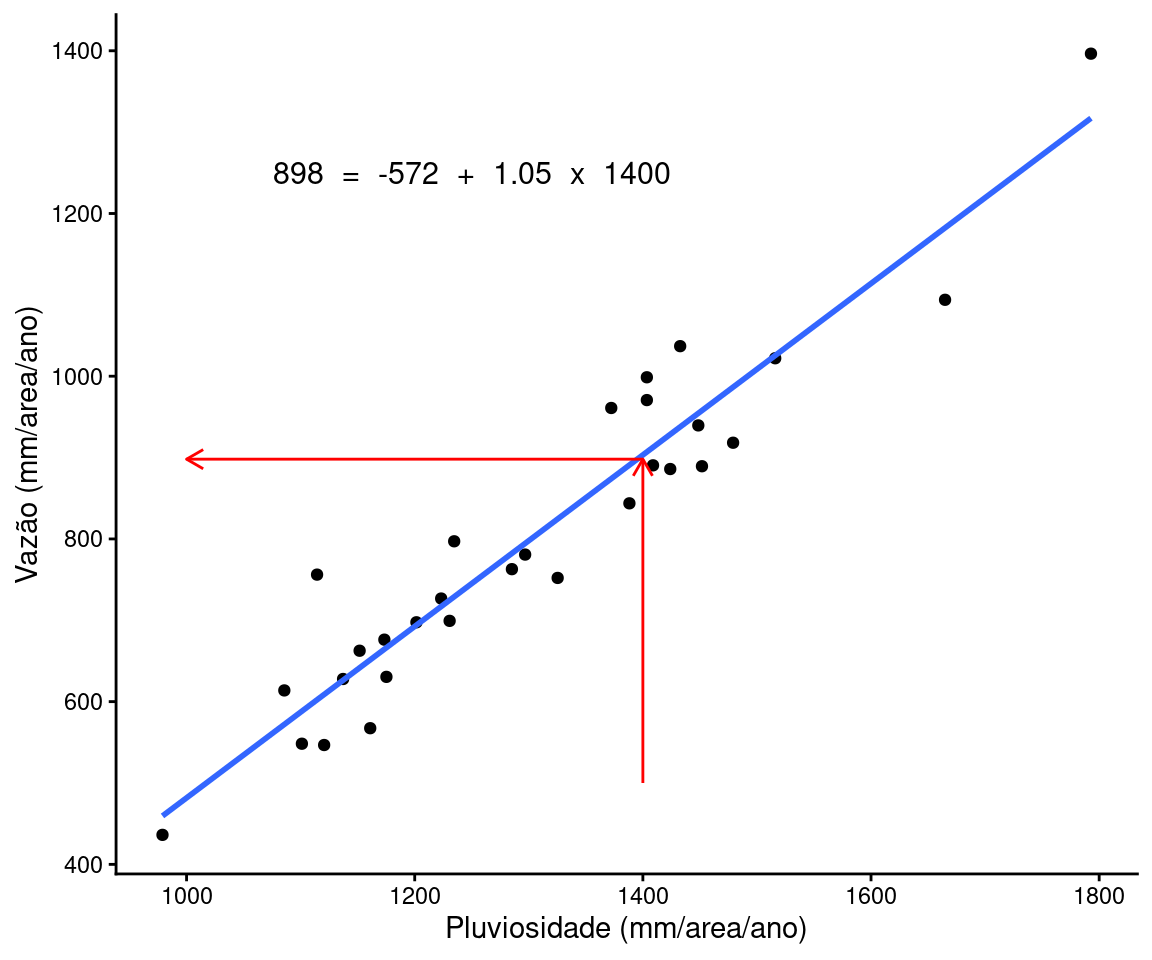 Esta linha nos permite obter uma estimativa sobre a vazão esperada (\(Y\)) para qualquer dado volume de chuva (\(X\)). Neste exemplo, a equação que melhor associa vazão e chuva é: