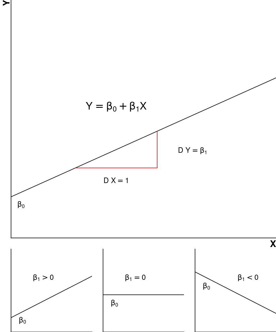 Na regressão linear simples, o parâmetro \(\beta_1\) é geralmente o de maior interesse. Este parâmetro nos dirá se a relação será crescente (\(\beta_1 > 0\)), decrescente (\(\beta_1 < 0\)) ou nula (\(\beta_1 = 0\)). \(\beta_0\) é o \(\textbf{intercepto}\) e expressa o ponto em \(Y\) em que a reta cruza o eixo das ordenadas.
