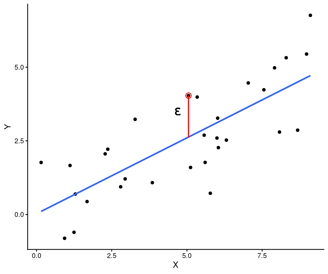 A porção estocástica, é representada pelo resíduo ou erro. A cada observação \(Y_i\) está associado um valor de resíduo correspondente (\(\epsilon_i\)), dado pela distância vertical entre \(Y_i\) e o valor predito \(\hat{Y_i}\) sobre a reta de regressão.