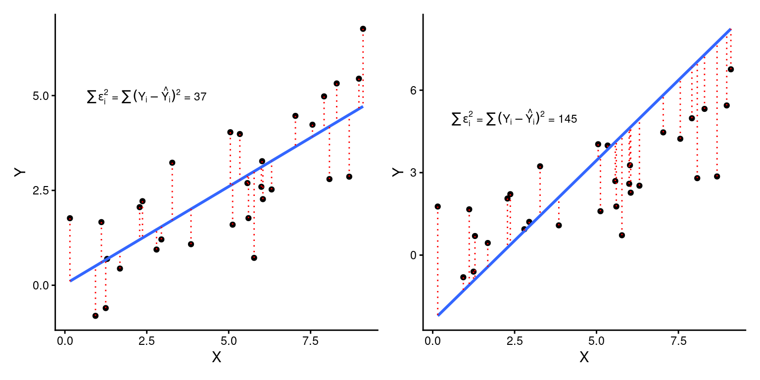 Nas figuras acima, a linha da esquerda (\(SQ_{Resíduo} = \sum{\epsilon_i^2} = 37\)) está claramente melhor ajustada à nuvem de pontos, o que se expressa em um menor somatório dos quadrados dos resíduos (\(SQ_{Resíduo} = \sum{\epsilon_i^2} = 37\)) quando comparado com o ajuste da figura à direita (\(SQ_{Resíduo} = \sum{\epsilon_i^2} = 145\)).