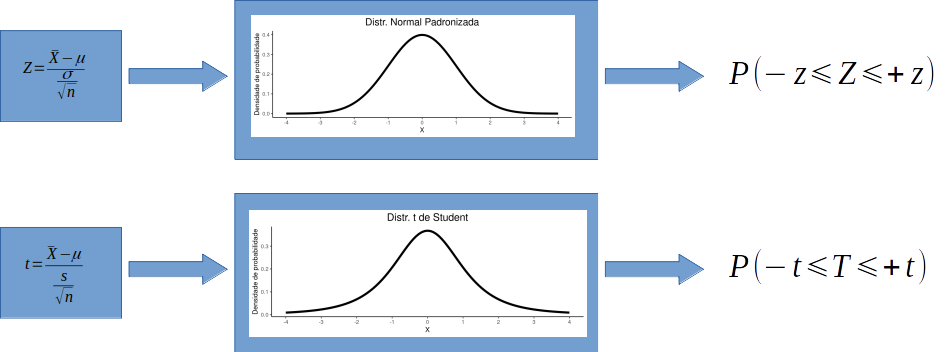 O cálculo de \(t\) é muito similar ao escore \(Z\). No entanto, substituímos \(\sigma\) por \(s\). As distribuições de \(t\) e de \(Z\) são muito similares. Entretanto, para amostras pequenas e quando \(\sigma\) é desconhecido, a curva de \(t\) nos fornece uma melhor estimativa das probabilidades associadas a distribuição das médias amostrais.