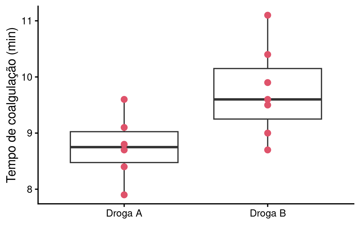 Uma vez que a probabilidade associada ao valor de \(t\) é menor que o nível de significância, rejeitamos \(H_0\) e assumimos que os tempos médios de coagulação são diferentes. Ao avaliar as média amostrais \(\overline{X}_A\) e \(\overline{X}_B\), concluímos que a droga \(A\) resulta, em média, em tempos menores de coagulação.