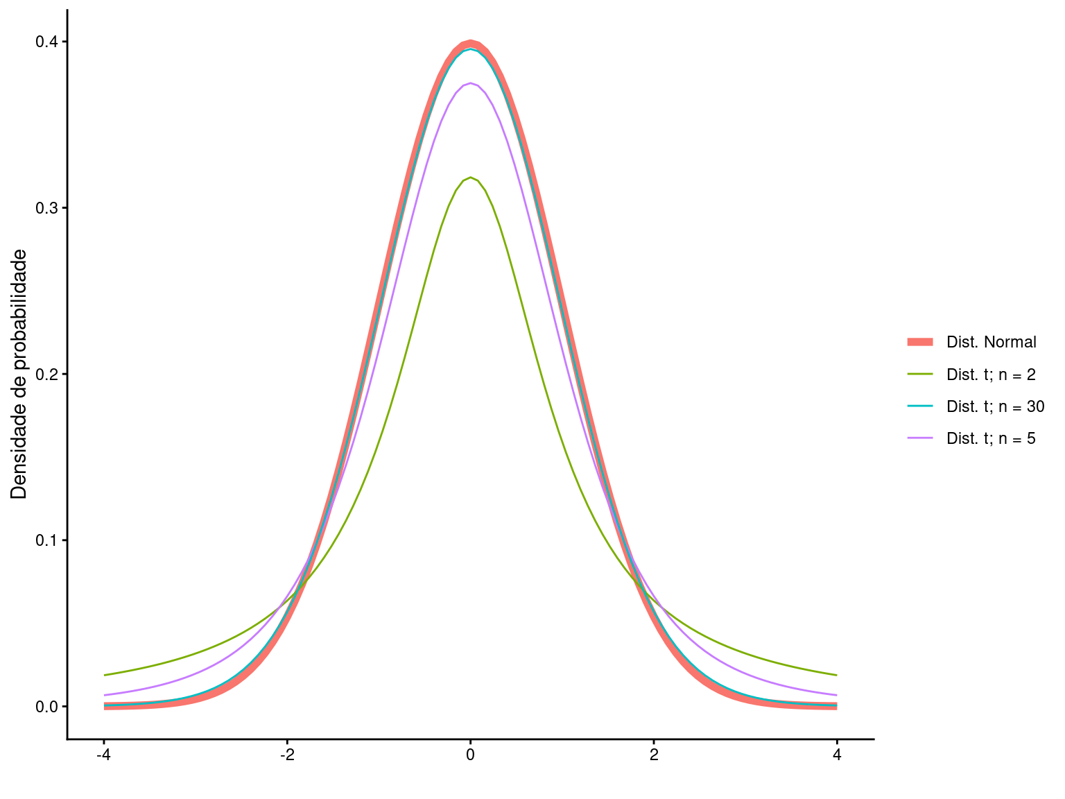 À medida que os graus de liberdade aumentam, o formato da distribuição \(t\) se assemelha ao formato da distribuição Normal padronizada. De fato, para graus de liberdades altos (ex. \(n \ge 30\)), os formatos das distribuições \(Z\) e \(t\) são praticamente indistinguíveis. Na prática, isto faz que as distribuição \(Z\) raramente seja utilizada.