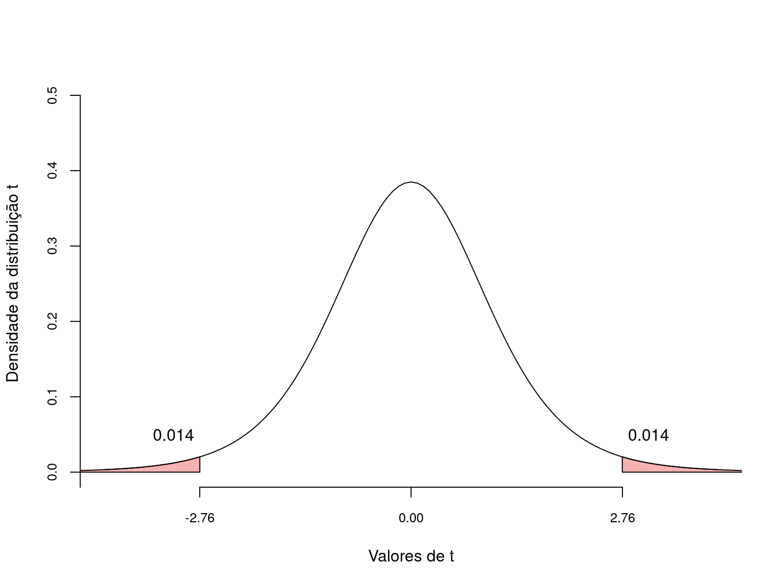 Na distribuição t, a probabilidade de encontrar valores tão ou mais extremos que 2.476 é de \(p = 0.031\).