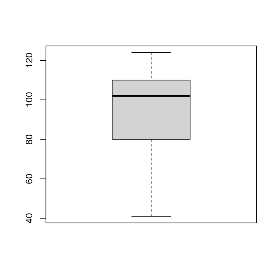 A linha do meio representa a mediana da variável, enquanto os limites das caixas representam o \(1^o\) e \(3^o\) quartis e as linhas externas representam os pontos mínimo e máximo. Estes limites podem ser obtidos com o comando: