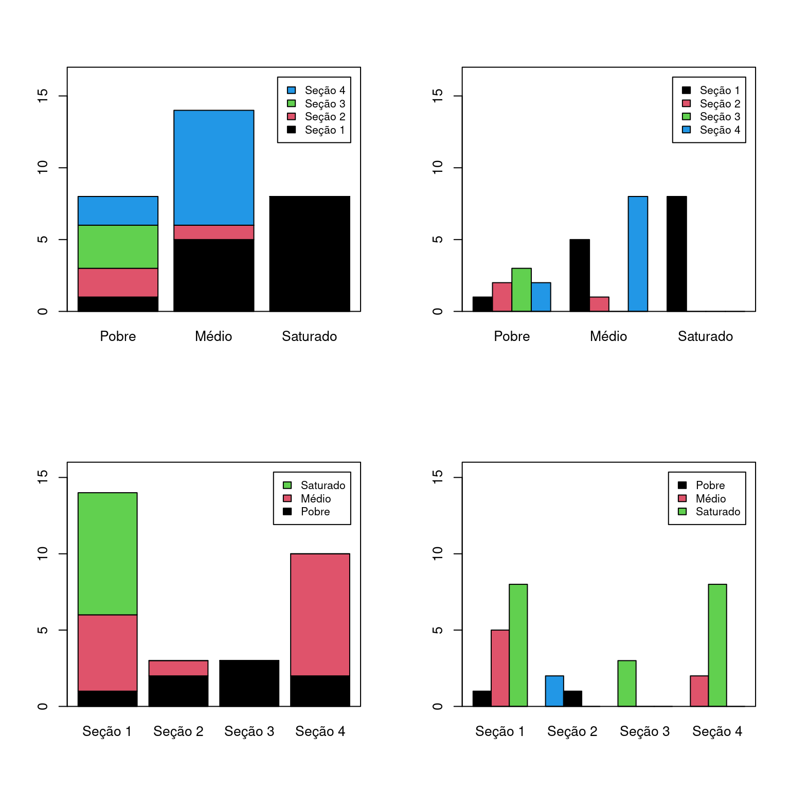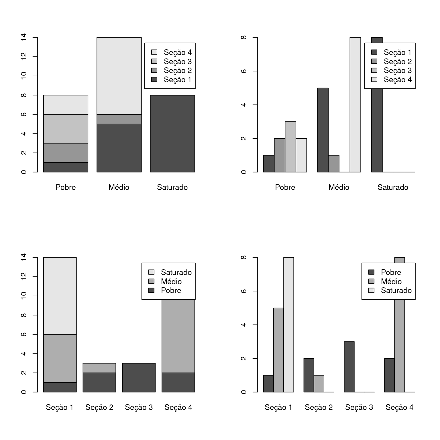 beside = TRUEfaz com que as barras apareçam lado-a-lado ebeside = FALSEresulta em cada barra representa a variável principal subdividida nos níveis da variável secubdária.Em todos os gráficos foi adicionada uma legenda.