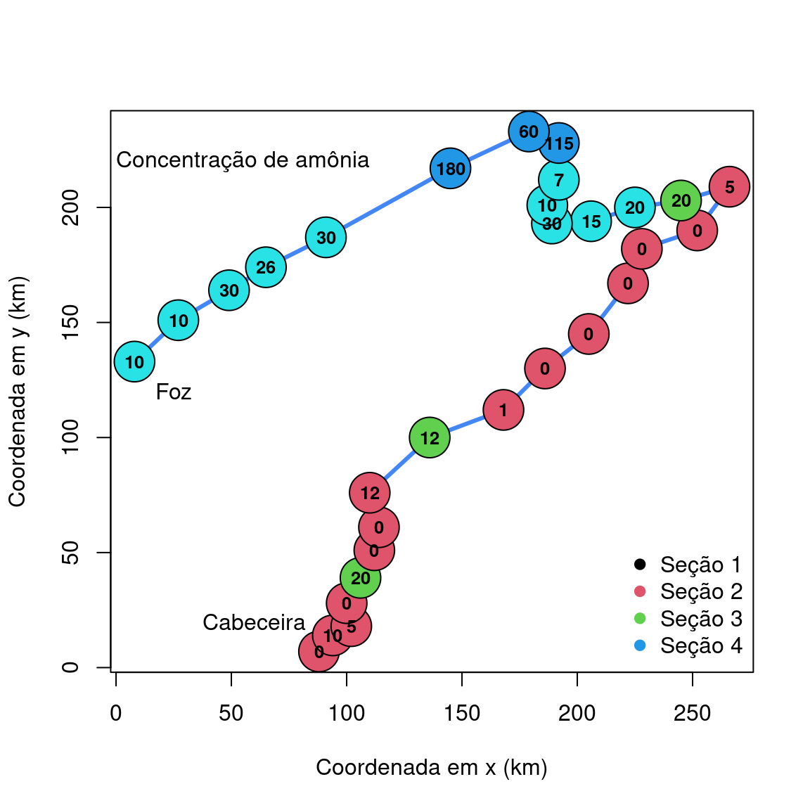 text(x = 55, y = 220, labels = "Concentração de amônia")